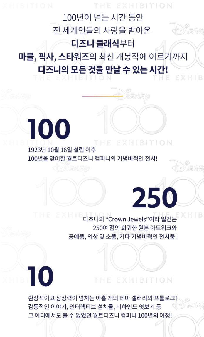 디즈니 100주년 특별전은 1923년 10월 16일 설립 이후 100년을 맞이한 월트 디즈니 컴퍼니의 기념비적인 전시회입니다.